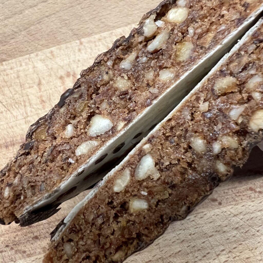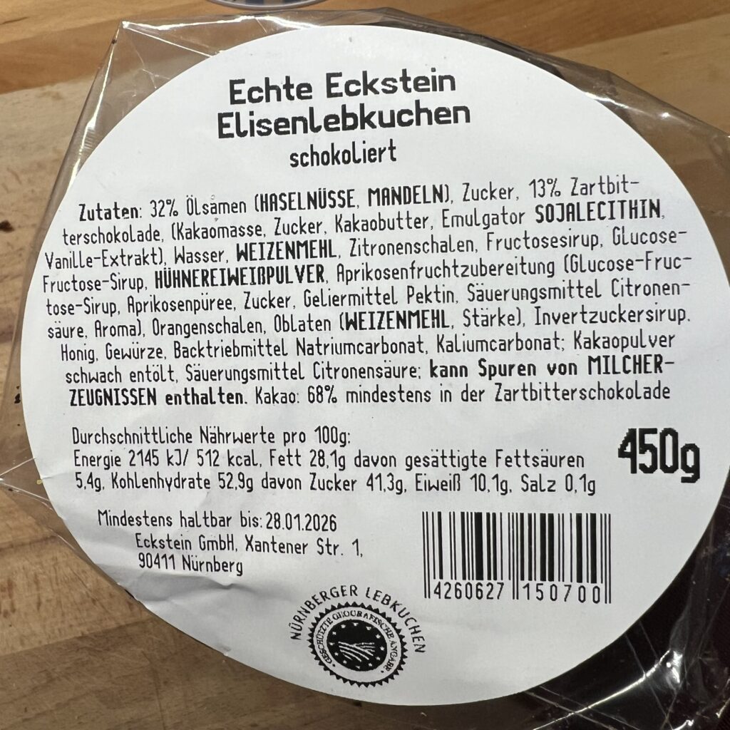 Das ist ein gut gemachter Lebkuchen, elegant und harmonisch komponiert, im Vergleich mit Industrieprodukten natürlich haushoch überlegen. Natürlich könnte man bei der Herausarbeitung der Einzelaromen noch etwas Gas geben, die Zutatenliste liest sich im Vergleich zu Bäckerlebkuchen dann doch noch etwas massentauglicher (Trockeneiweiß statt echtem, Aprikosenzubereitung statt Konfitüre…).