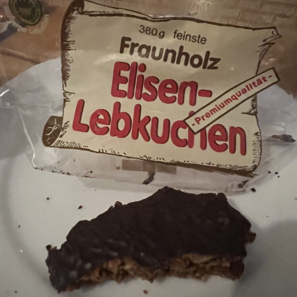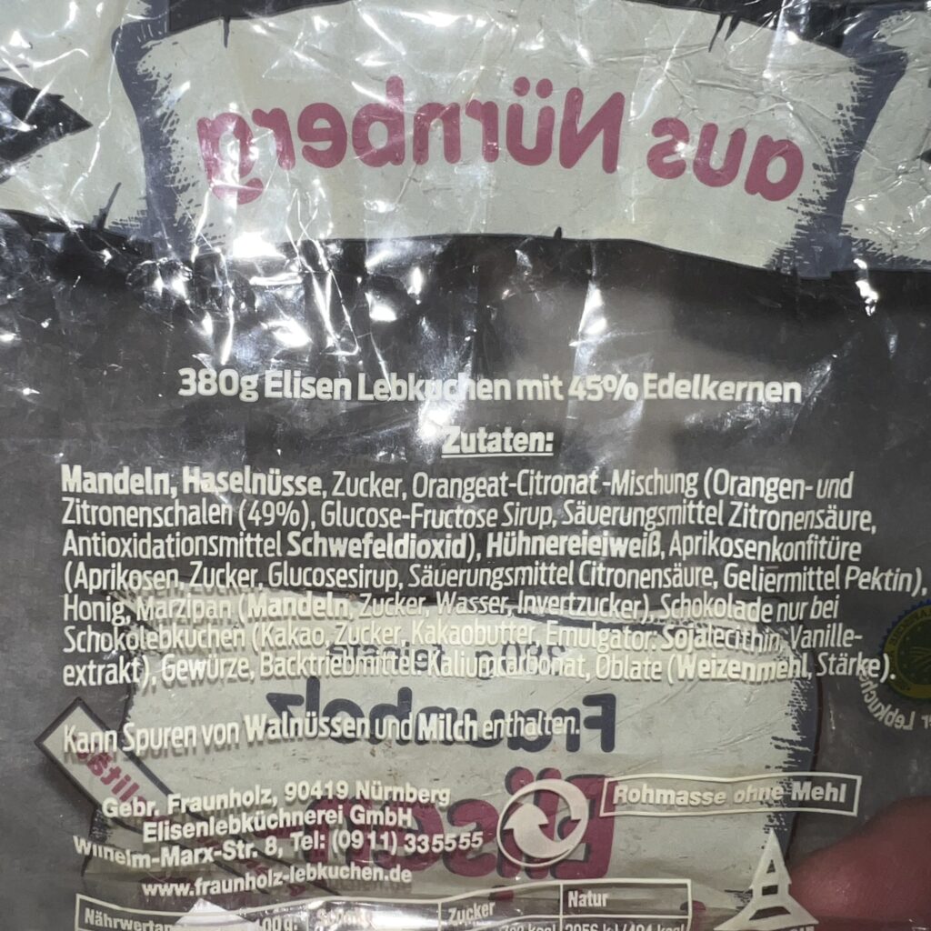 Allerdings, auch ein Grund für meine Entscheidung: Die Nussaromatik ist vor allem von Mandelaroma geprägt. Also nicht nur Marzipan, auch echte Mandeln. Und nun weiß der Nürnberger ja, dass dies das Markenzeichen von Fraunholz ist, kein Mehl zu verwenden und als erste Zutat eben Mandeln.
