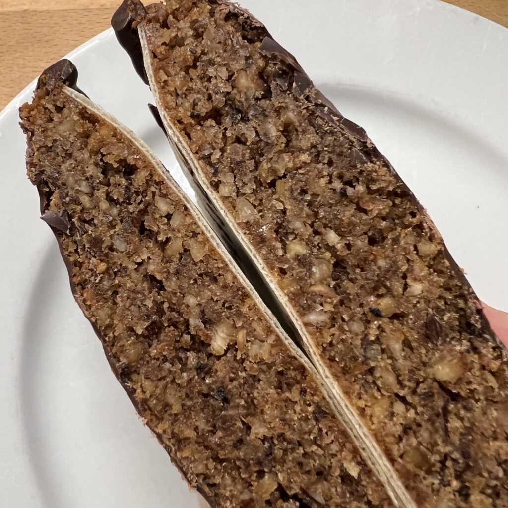Die Konsistenz ist einheitlich durchgebacken, ohne zu trocken zu wirken, sehr einheitlich auch in der stringenten Aromatik, erinnert der Lebkuchen an ein sehr elegantes Konfekt, Makronen oder sehr feine Nussecken.