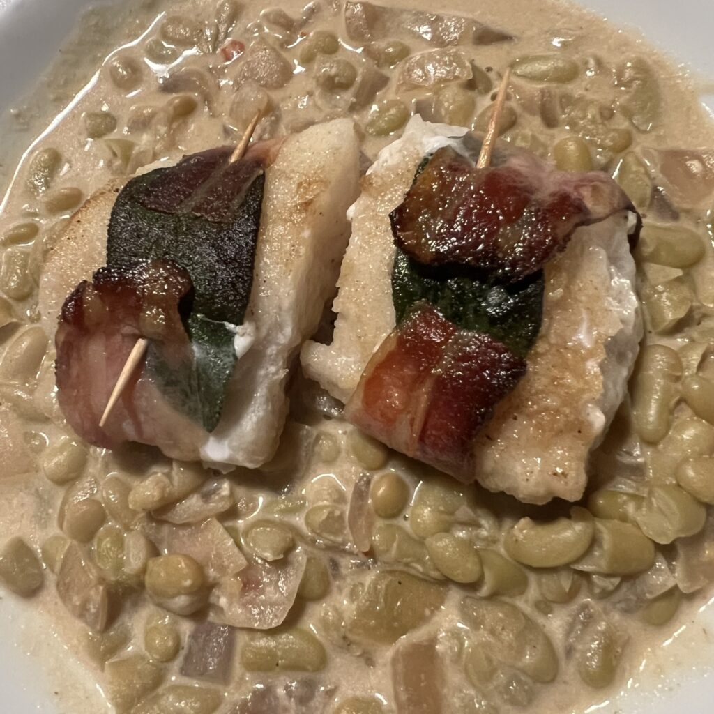 Darum haben wir es mit einem Steinbeißer Saltimbocca-Art auf cremigem Bett aus süßen Roscoff-Zwiebeln und Saubohnen, Knoblauch und Chili kombiniert.