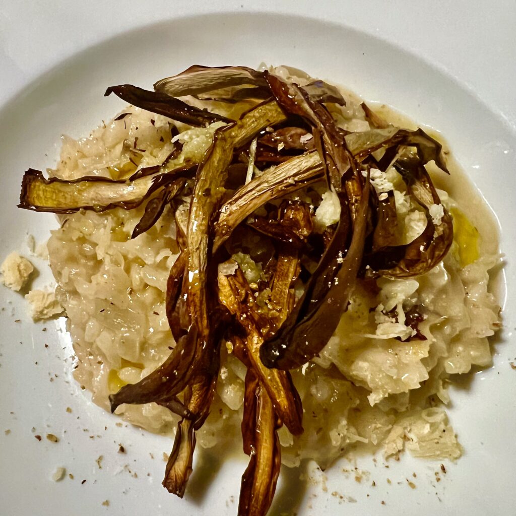 Die Spitzen im Ofen knusprig gegrillt, das Untere kleingeschnitten mit Tropea-Zwiebeln ins Risotto. Gutes Olivenöl und weißer Pfeffer drüber, fertig.