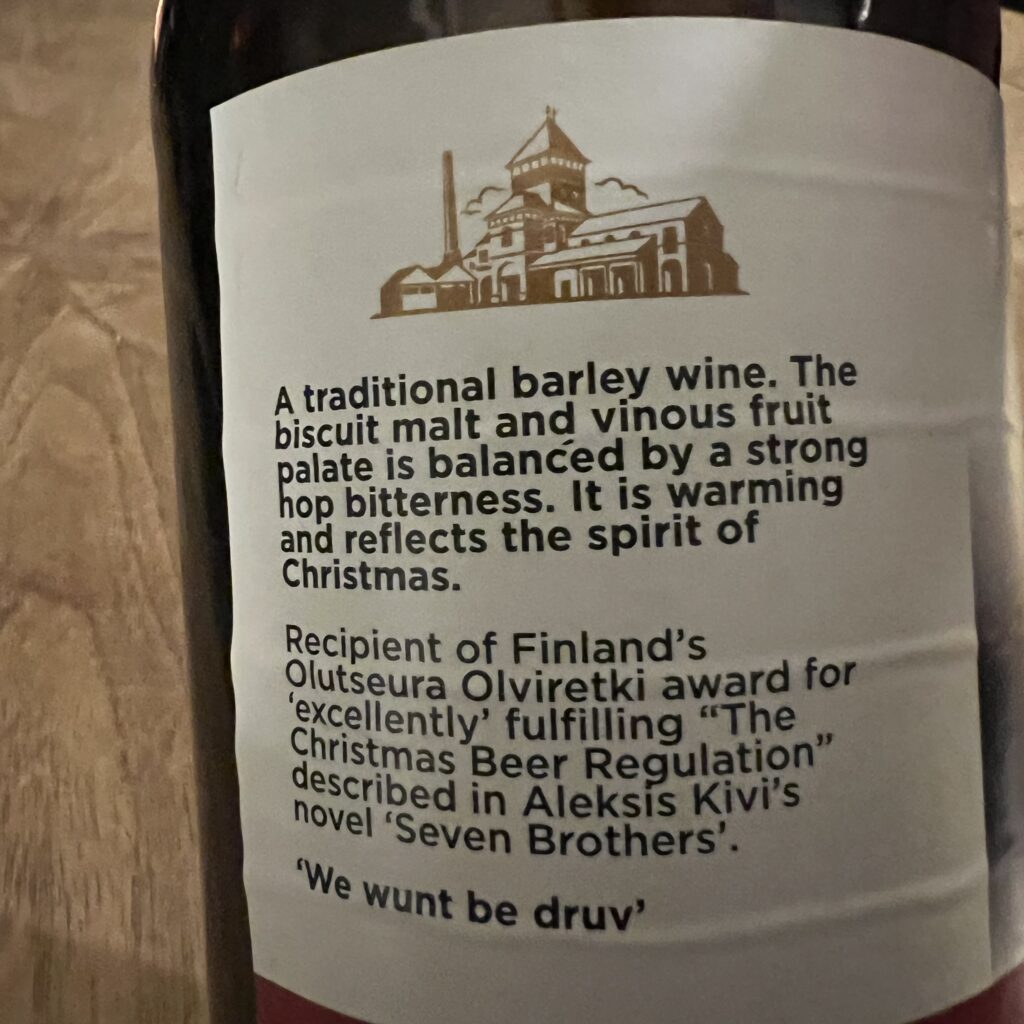 Geschmeidig-cremige und vollmundige Textur mit Unmengen Noten von Bisquit, roten Beeren, extrem reifen Zwetschgennoten, Rumrosinen und Datteln. Das alles verbunden mit einer dunkel-malzigen Süße und wunderbar gepuffert mit großen Mengen englischen Hopfens. Die Brauerei selbst beschreibt das Bier als Christmas Pudding im Glas. Ein sehr befriedigendes Bier mit extrem niedrigem Trinkwiderstand und langem Nachhall am Gaumen.
